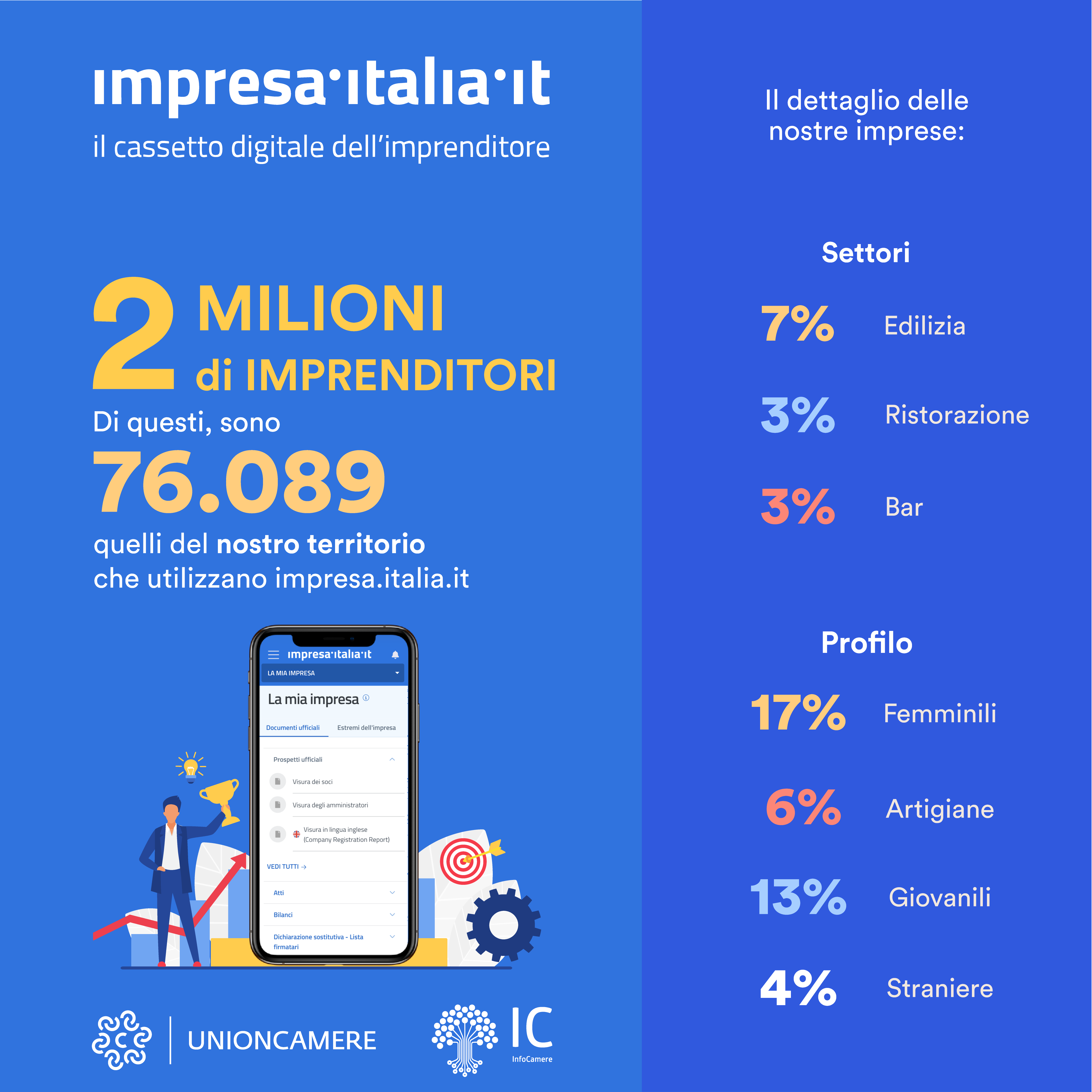 Sono oltre 76mila gli imprenditori del territorio che hanno aderito a impresa.italia.it, il servizio della Camere di Commercio di Napoli realizzato da InfoCamere con cui i titolari e legali rappresentanti delle aziende possono accedere, scaricare e condividere (anche in mobilità e senza alcun costo) i documenti ufficiali della propria impresa, presenti nel Registro delle imprese: atto costitutivo, statuto, bilanci, planimetrie degli immobili aziendali, visure, asseverazioni e tanti altri ancora. Grazie al servizio, gli imprenditori che lo usano hanno potuto scaricare fino ad oggi – senza alcun costo – 7,4 milioni di documenti ufficiali delle proprie aziende, completamente dematerializzati (dato nazionale). “Questo traguardo conferma che il Sistema Camerale sta interpretando il concetto di trasformazione digitale nel senso più vicino alle esigenze delle imprese – ha detto Il presidente della Camera di Commercio di Napoli e di Unioncamere Campania, Ciro Fiola - mettendo al centro semplicità d’uso, portabilità, sicurezza. Non solo, ogni adesione rappresenta un imprenditore dotato di identità digitale che, grazie all'utilizzo di smartphone e tablet, acquisisce sempre maggior consapevolezza del valore del patrimonio informativo delle Camere di Commercio. Un patrimonio che l’imprenditore stesso ha contribuito a creare e che, in questo modo, la sua Camera gli restituisce con il valore aggiunto del digitale.” Chi sono gli imprenditori “digitali” e cosa fanno le loro imprese Il 17% guida un’impresa femminile, il 6%% è artigiano, il 12,8 % è rappresentante di un’impresa ‘under 35’, il 6.70% opera nel settore edile e il 2,9 % in quello della ristorazione. SCHEDA INFORMATIVA Impresa.italia.it è oggi una web-app disponibile all’indirizzo impresa.italia.it e nel 2023 è attesa la versione scaricabile dai principali app store. Progettata secondo la metodologia mobile first, è perfettamente fruibile da smartphone e tablet oltre che utilizzabile anche dal computer della propria scrivania. Il servizio è collegato anche ad Atlante i4.0 (il portale di Unioncamere e Ministero delle Imprese e Made in Italy dedicato alla Transizione Digitale), è articolato in 6 sezioni: • La mia impresa • Registro Imprese • Il mio fascicolo • Attività Produttive • Diritto Annuale • Startup e PMI innovative. Dall’app è anche possibile accedere alle pratiche inviate al SUAP (lo Sportello Unico delle Attività Produttive) di otre 4mila Comuni che ad oggi utilizzano la piattaforma nazionale impresainungiorno.gov.it realizzata dal sistema camerale, così come agli atti presenti nel fascicolo d’impresa. Se poi l’impresa ha aderito al servizio di gestione delle proprie fatture elettroniche offerto dalla Camera di Commercio, dall’applicazione è possibile seguire anche il flusso di queste informazioni. Impresa.italia.it è anche uno strumento di Open Innovation giacché consente di accedere ai dati sulle Startup innovative italiane, un eco-sistema di imprese in rapida evoluzione e che può essere scandagliato per individuare possibili partner a vocazione innovativa. Tutti i documenti sono scaricabili e condivisibili in tempo reale - via mail, WhatsApp o altri sistemi di condivisione - con clienti, fornitori, banche, professionisti e PA: ad esempio, per adempimenti normativi o per partecipare a gare o bandi anche di dimensione internazionale, vista la disponibilità della visura dell’impresa già tradotta in inglese. L’uso del servizio non è soltanto facilissimo ma anche estremamente sicuro: l’accesso è consentito a titolari e rappresentanti legali ma anche – in modalità consultazione - alle persone con cariche nell’azienda, previa autenticazione tramite identità digitale, sia essa SPID o la CNS Carta Nazionale dei Servizi (ottenibili anche presso la propria Camera di Commercio). La web-app è nativamente integrata con ID Token Digital DNA, una delle soluzioni delle Camere di Commercio per l’identità digitale, che consente un uso combinato con la firma digitale. La spinta della pandemia Come accaduto per altri servizi digitali, le adesioni e l’utilizzo di impresa.italia.it hanno vissuto un’importante accelerazione durante la pandemia da Covid-19. Durante l'emergenza sanitaria, la richiesta e l’ottenimento di contributi era inevitabilmente condizionato alla produzione di specifici documenti tra cui, quasi sempre, la visura e l’eventuale bilancio: la possibilità di disporne e condividerli gratuitamente è stata molto apprezzata dagli imprenditori tanto da continuare ad utilizzarlo abitualmente per la partecipazione a bandi, richieste di finanziamento e accessi a voucher. Una best practice per la Pa che guarda al futuro Impresa.italia.it è un servizio innovativo su più fronti. Non solo ha cambiato il modo di lavorare di chi lo usa, ma è anche diventato una best practice per la Pubblica Amministrazione per la costruzione di un ecosistema digitale sostenibile. Si è infatti aggiudicato il premio “Valore Pubblico: la Pubblica Amministrazione che funziona”, promosso da Sda Bocconi School of Management insieme al Gruppo Gedi. Il riconoscimento, promosso da SDA Bocconi, celebra le esperienze nella PA da emulare perché più innovative e foriere di benefici concreti per cittadini e imprese. “Promuove la digitalizzazione delle imprese. Fornisce online, senza vincoli geografici e orari, documenti fondamentali per le aziende. Migliora l’efficienza e riduce i costi per il Sistema Paese”. Infine, impresa.italia.it sarà il punto di contatto tra imprese e PA previsto dall’ultimo decreto Semplificazioni per consentire alle imprese di dialogare in modo efficiente e trasparente con la Piattaforma Digitale Nazionale Dati (PDND), lo strumento istituito dal Governo per semplificare e velocizzare l’accesso alle informazioni pubbliche.