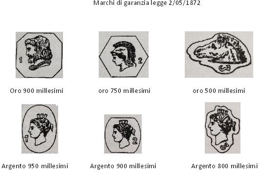 Con l’unità d’Italia gli orafi napoletani mantennero i marchi precedentemente usati e ciò fino a quando venne introdotta la nuova normativa: la legge n. 806 del 2/5/1872 con la quale venivano resi uniformi i titoli dell’oro e dell’argento su tutto il territorio dello stato italiano. Il marchio che attestava il titolo veniva apposto sull’oggetto dopo che ne era stata riconosciuta l’esattezza dagli uffici di saggio. La caratteristica della norma era che il fabbricante non aveva l’obbligo di apporre il marchio di stato sugli oggetti di sua produzione ma poteva farlo facoltativamente e pagando i relativi diritti allo stato.