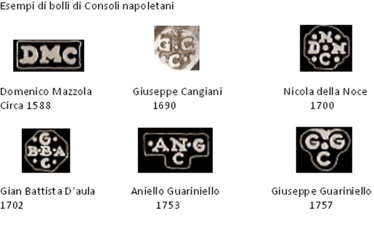 Il titolo del metallo veniva poi garantito da un sistema di controllo che vedeva coinvolte la Corporazione degli Orefici, il Console in carica e l’orafo stesso. Esisteva pertanto una triplice marcatura sugli oggetti in metallo prezioso e ciò per la seguente ragione: la Corporazione degli Orefici, per una tradizione che affondava le sue radici nel medioevo, vigilava sul monopolio dell’esercizio del mestiere, impedendo che artigiani non iscritti alla Corporazione potessero esercitare e, nello stesso tempo, effettuava quello che oggi noi chiameremmo un “controllo di qualità sul processo produttivo” verificando che le materie prime, gli strumenti di lavoro, le tecniche lavorative permettessero alla corporazione il mantenimento di un determinato standard. Il Console, invece, era un artigiano esperto ed affermato, che faceva eseguire il saggio sull’oggetto per verificare che il titolo fosse quello legale e “certificava” ciò con l’apposizione del proprio sigillo. Infine l’orafo apponeva sull’oggetto le sue iniziali attraverso le quali si assumeva la “paternità “ dell’oggetto prodotto.