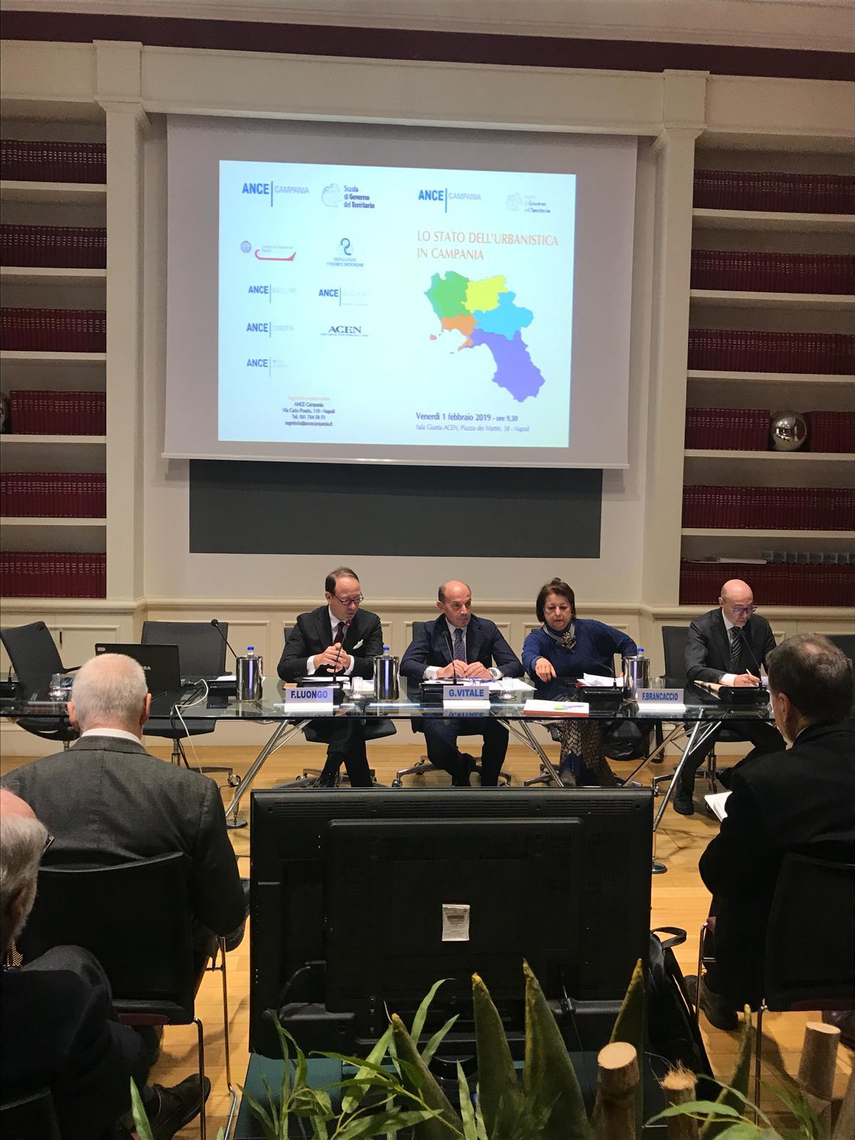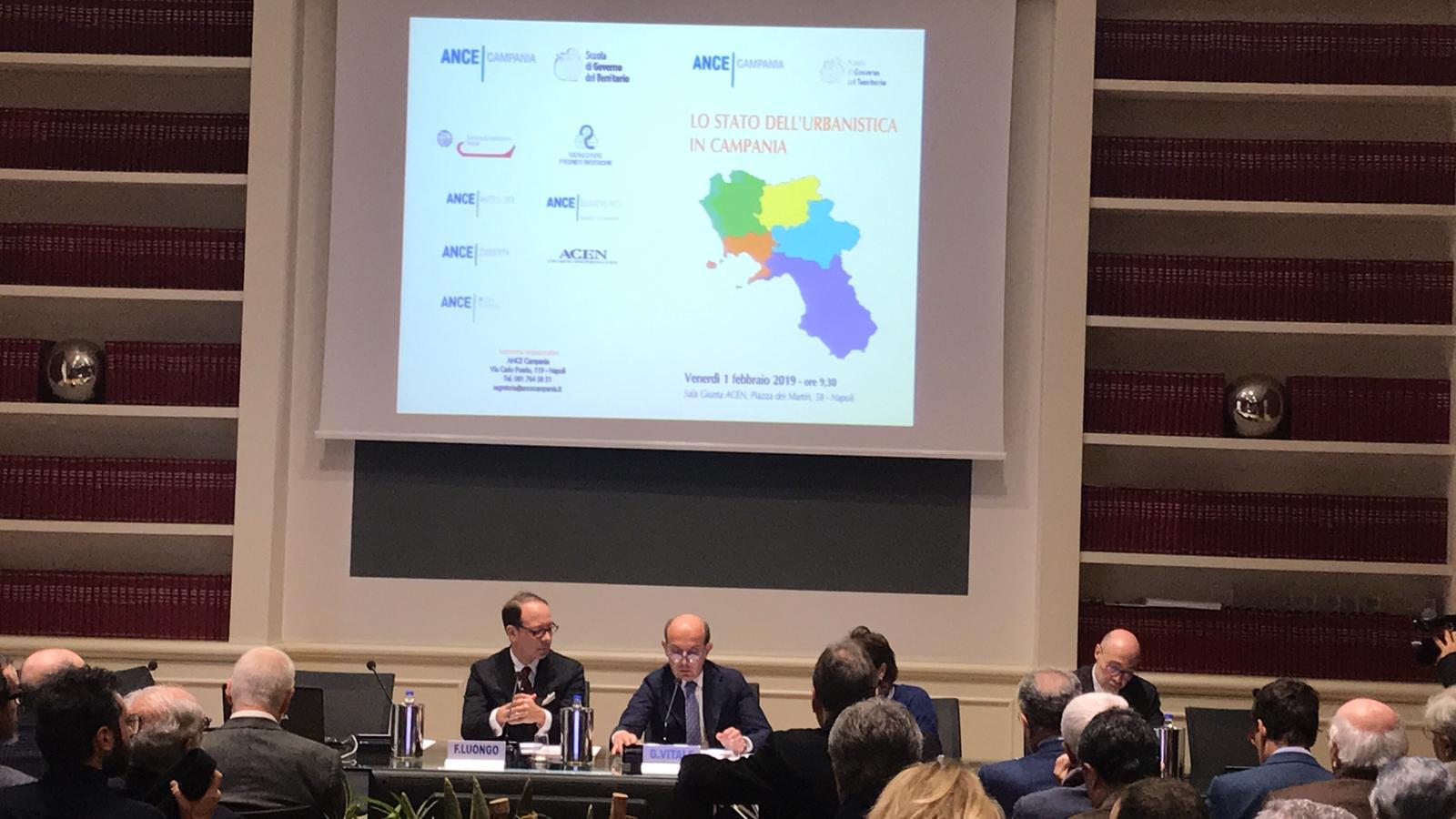 Lo scorso 1 febbraio 2019 è stata presentata la ricerca "La pianificazione urbanistica in Campania", promossa da ANCE Campania e Scuola di Governo del Territorio dove è intervenuto il Vice presidente vicario della CCIAA di Napoli, Fabrizio Luongo, che ha portato il saluto e l’apprezzamento del Presidente Ciro Fiola per il lavoro svolto.
